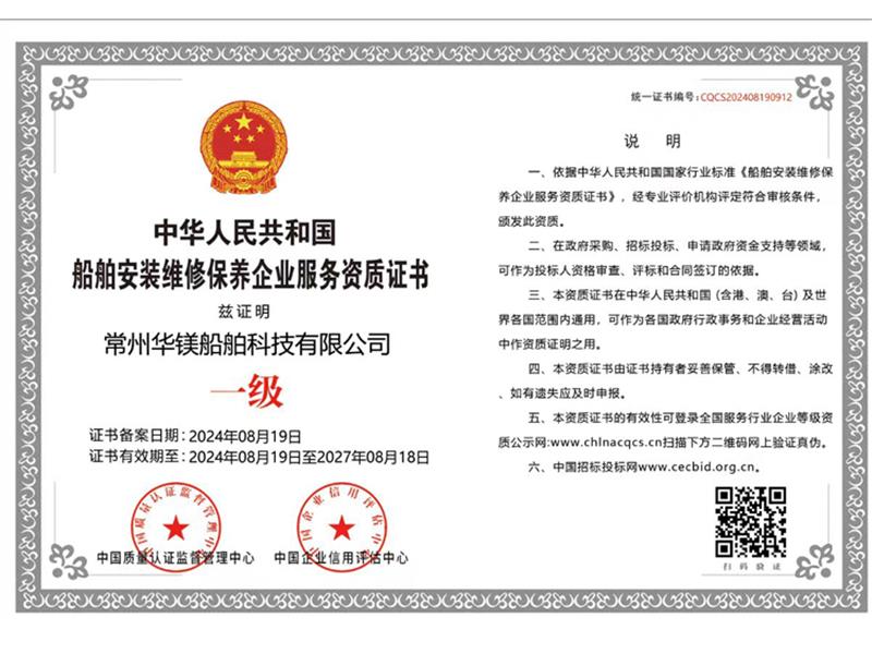 船舶安裝維修保養(yǎng)企業(yè)服務(wù)資質(zhì)一級證書
